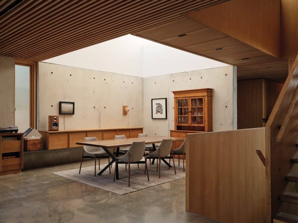 At the heart of the home, an open staircase connects the two floors with a double-height space, where a light screen above the dining area acts as a sculptor, transforming daylight into a moving painting that changes from morning to evening. The same scene repeats in the artist’s upper studio, where she adjusts her abstract paintings according to the shifting light throughout the day. To ensure the precision of this lighting performance, the architects used a virtual reality (VR) model to allow the clients to test the lighting before construction, the first time the firm had applied this technology.