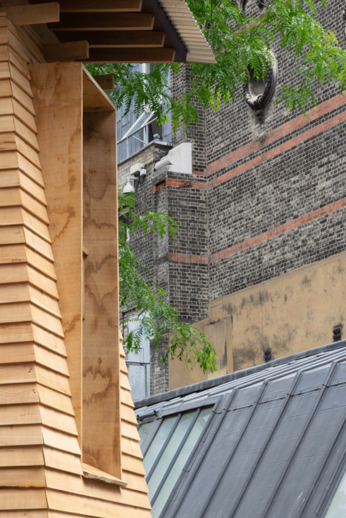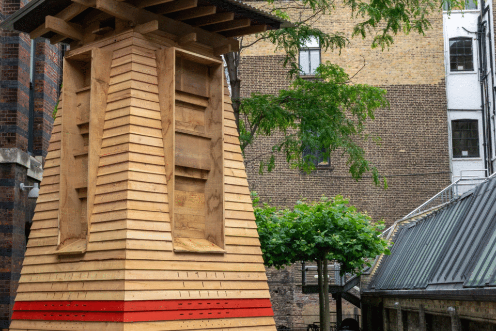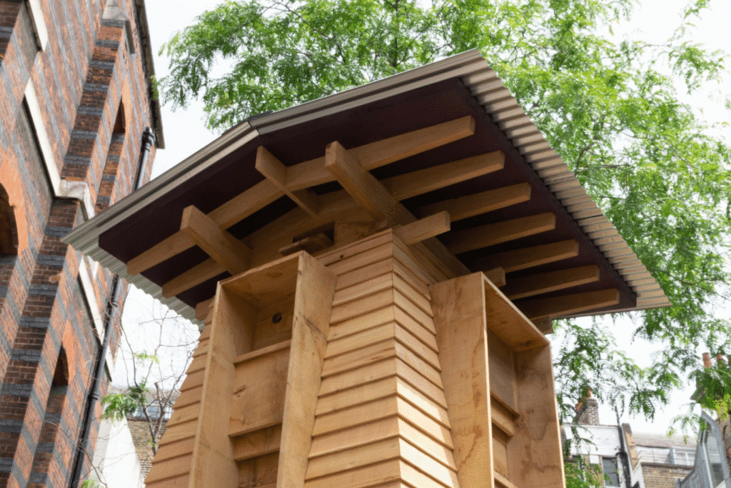 Installed in the Lovelace Courtyard until 17 August, Hrōst combines architectural aesthetics with ecological thinking. The name “Hrōst” comes from the Old English word for “roost,” nodding to its mission: to offer birds, bats, insects, and small mammals places to shelter, roost, hibernate, and thrive. The project was developed in collaboration with Price & Myers and built by BlokBuild using modular timber cassettes filled with wool insulation.