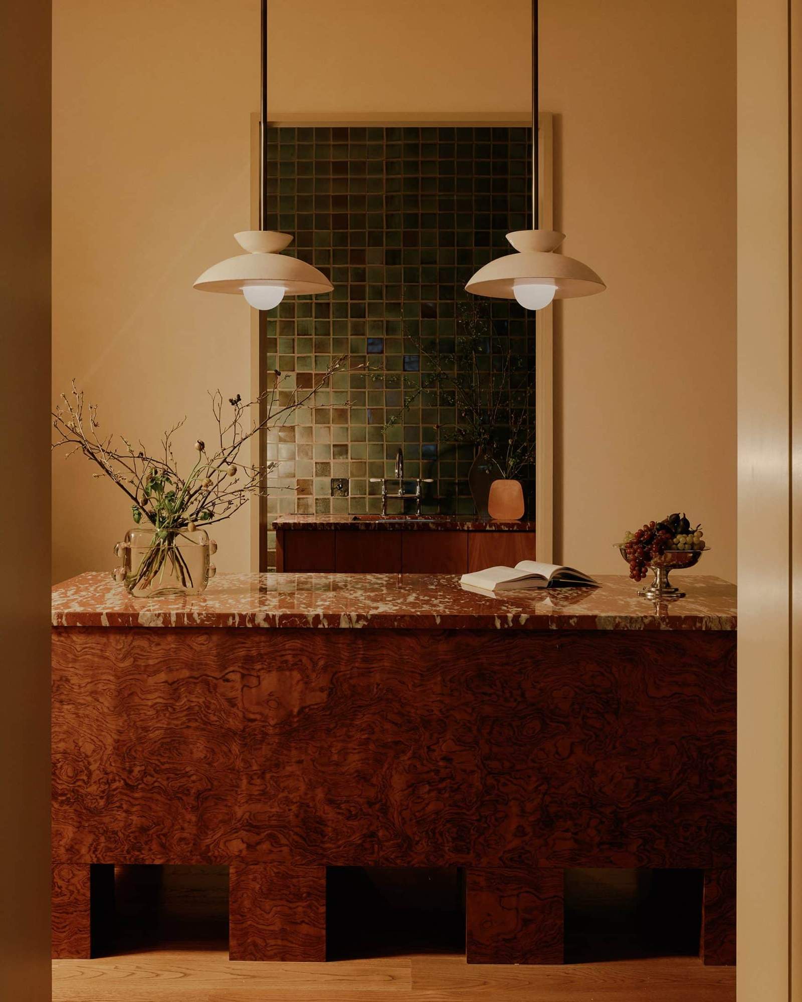 Since its inception six years ago, In Common With has collaborated with various designers to create unique lighting collections. These collaborations, featuring works by Sophie Lou Jacobsen, Danny Kaplan, and Simone Bodmer-Turner, are prominently displayed throughout Quarters in various forms including pendants, floor lamps, table lamps, and chandeliers. The launch of Quarters also marks the debut of In Common With’s first wooden furniture collection, featuring hand-painted trompe l’oeil surfaces and custom inlaid ceramics created with artist Shane Gabier.