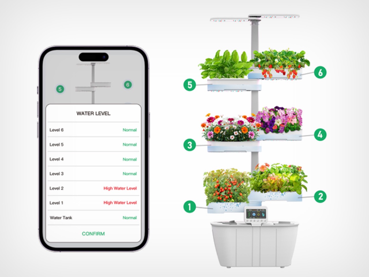 Moreover, most towers come with a 5.6-inch display showing all plant-related data, with the option to use a smartphone app to access this information. This additional control allows you to monitor water and light levels and make adjustments when necessary, while the automatic system manages water and light distribution to each tray to ensure continuous and healthy plant growth.