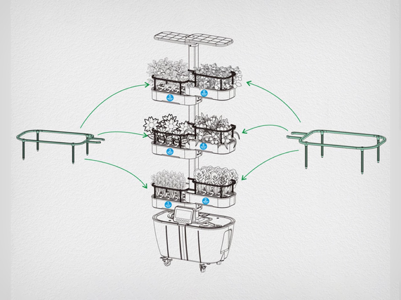 Each tray in the tower is mounted on an adjustable-height column, allowing optimal space for each type of plant. For plants that require extra support, such as tomato vines, the removable trellis provides the necessary support to prevent leaves from falling or plants from emerging from their designated capsule, ensuring healthy growth for every plant within the system.