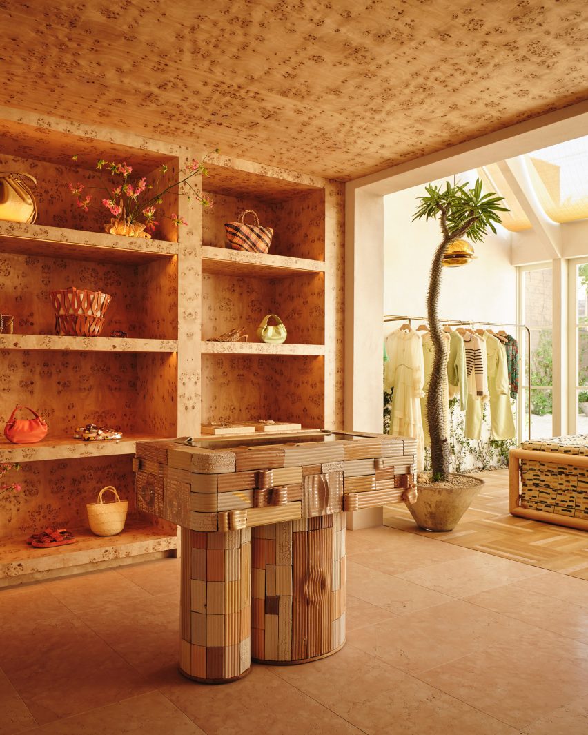 At the Ulla Johnson flagship shop in West Hollywood, American interior designer Kelly Wearstler combined a towering tree with vintage furniture by Carlo Scarpa and speckled burl wood paneling.