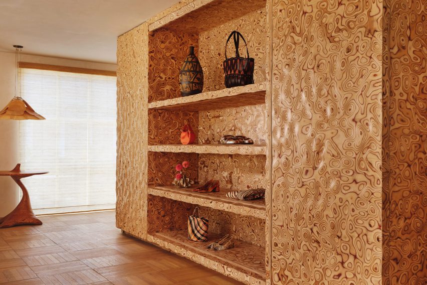 The expansive accessories area includes freestanding jewelry display cabinets created by Canadian artist Jeff Martin. The cases are echoed by floor-to-ceiling burl wood panels that are mottled and covered in peeling ribbons of caramel-colored, grooved tiles.