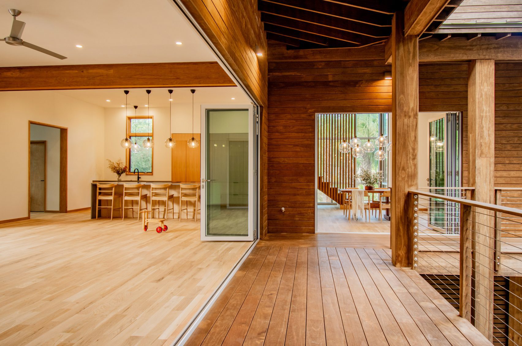 To minimize disturbance to the oak trees and mitigate the risk of flooding, Victory Bay House features a three-story vertical orientation with an L-shaped footprint. This thoughtful design approach not only preserves the natural beauty of the site but also maximizes views and natural light penetration. The elevated main level, constructed above the ground, offers protection from potential flooding, while the ground level accommodates non-conditioned spaces such as a garage, storage areas, and an outdoor shower.