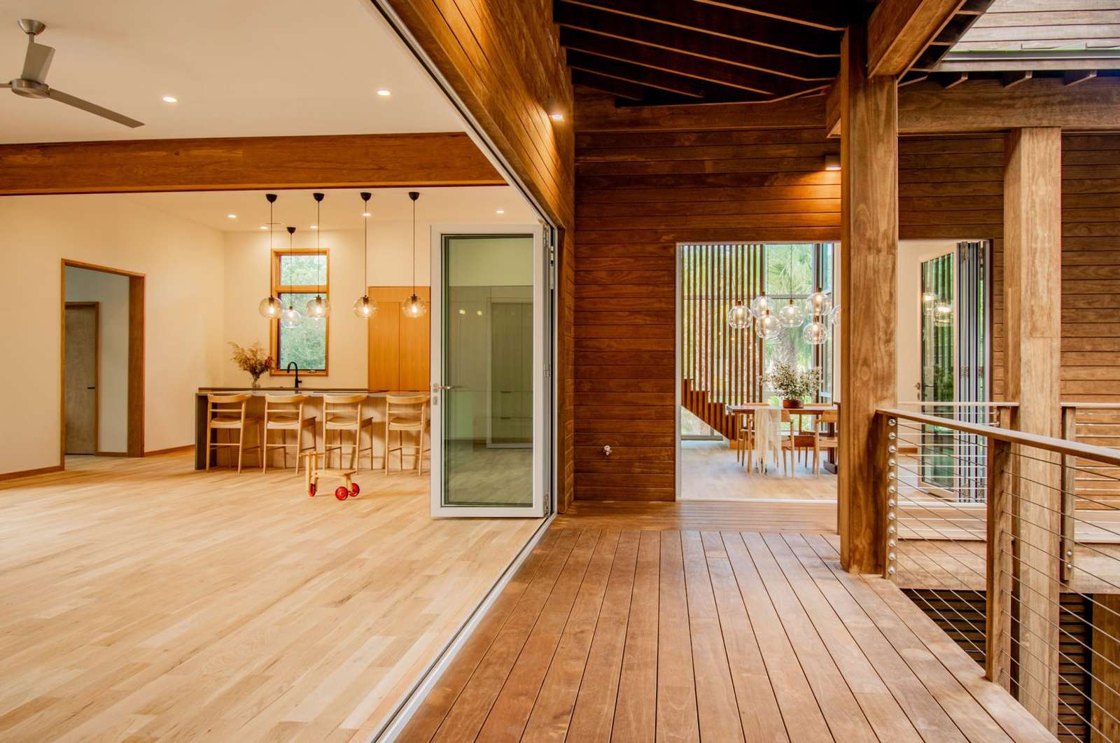 The interior layout of Victory Bay House is carefully curated to balance privacy, functionality, and connection to the outdoors. The main level encompasses the public zone, including a spacious living room, kitchen, dining area, and outdoor living space for seamless indoor-outdoor living. A guest bedroom provides accommodation for visitors, while the top floor features a primary bedroom suite and a private apartment area with additional bedrooms and a treetop porch.