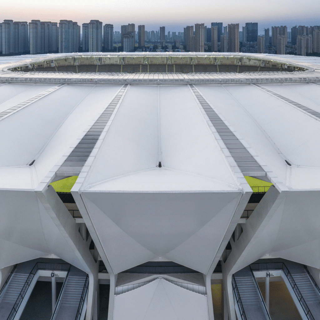 The structural system of the Kunshan Olympic Sports Centre combines reinforced concrete and lightweight steel. The concrete columns, arranged in pairs, form a fan-shaped rhythm around the building. Spanning between them, steel trusses support a translucent roof membrane that covers the seating areas. The use of fabric membrane reduces weight and creates angular roof profiles that give the stadium a recognizable identity. The outer façade is partially transparent, constructed with perforated metal to ensure ventilation while reducing bulk.