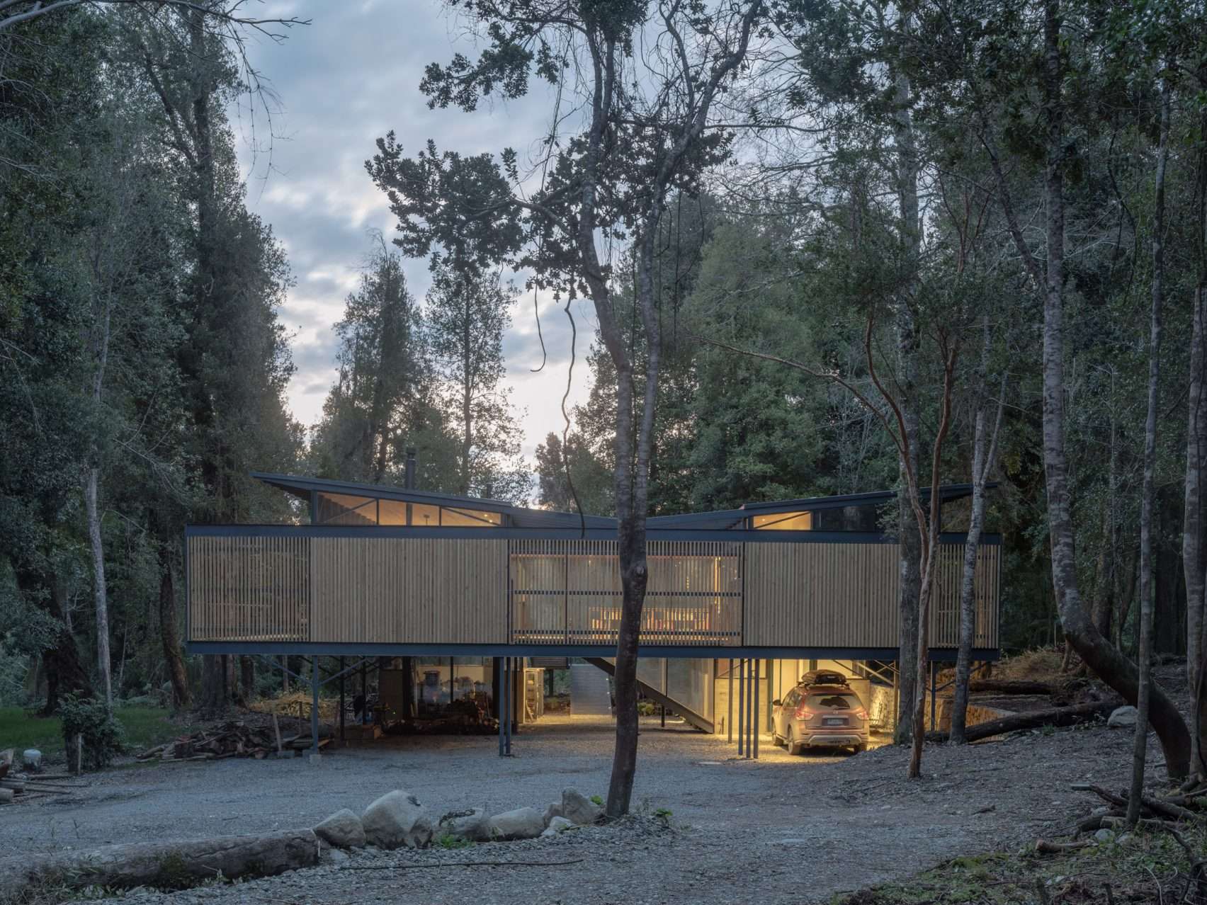 Hebra Arquitectos, a Chilean architecture studio, has brought to life the Lone Oak House, an elevated residence nestled within the lush forests of southern Chile. With its steel pilotis and distinctive V-shaped roof, this home is a modern marvel designed to seamlessly blend with its verdant surroundings.