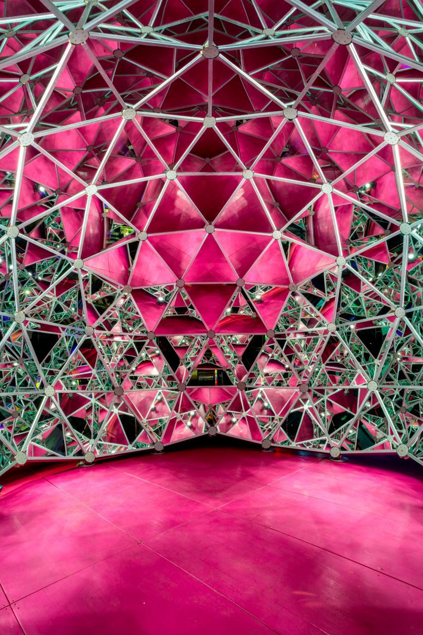 Director of spatial design Charles Dorrance-King told Dezeen that the team’s goal for the show was to honor the key elements, the exhilarating atmosphere, and the formal connections between the artwork displayed in Luna Luna’s 1987 Hamburg debut. They also wanted to acknowledge how different the German park with its trees and muck is from the Los Angeles soundstage it currently resides in.