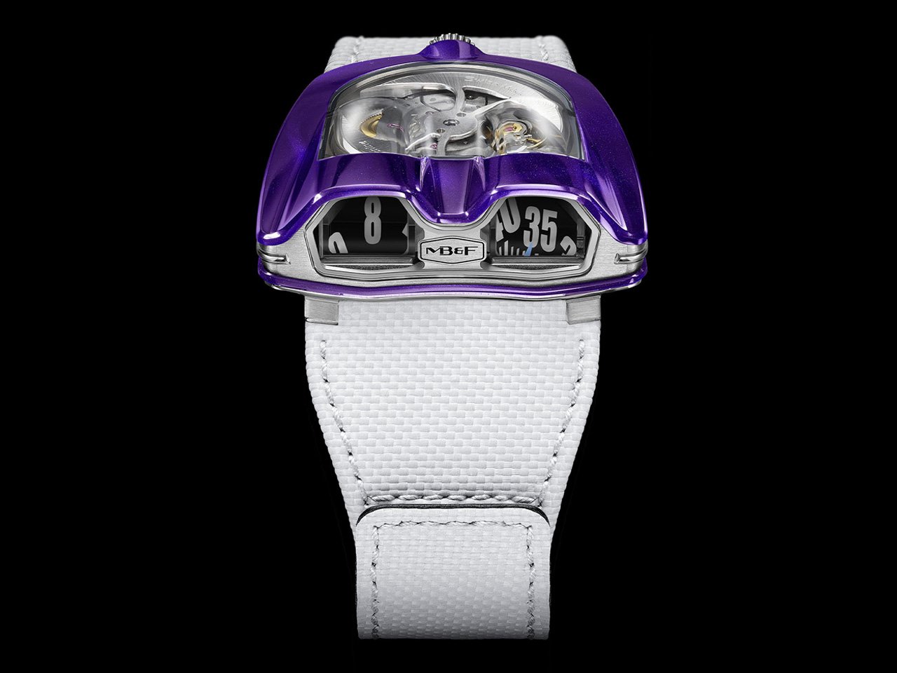 The purple version of the watch, the fourth release in this series, features a case made from titanium—one of the materials renowned for its lightness and durability. What stands out in this edition is that the external panels are not coated with traditional paint but use a metallic purple dye derived from metals, closely resembling the glossy finish used on luxury cars. This enhances the visual connection between the watch and the concept of speed and high performance.