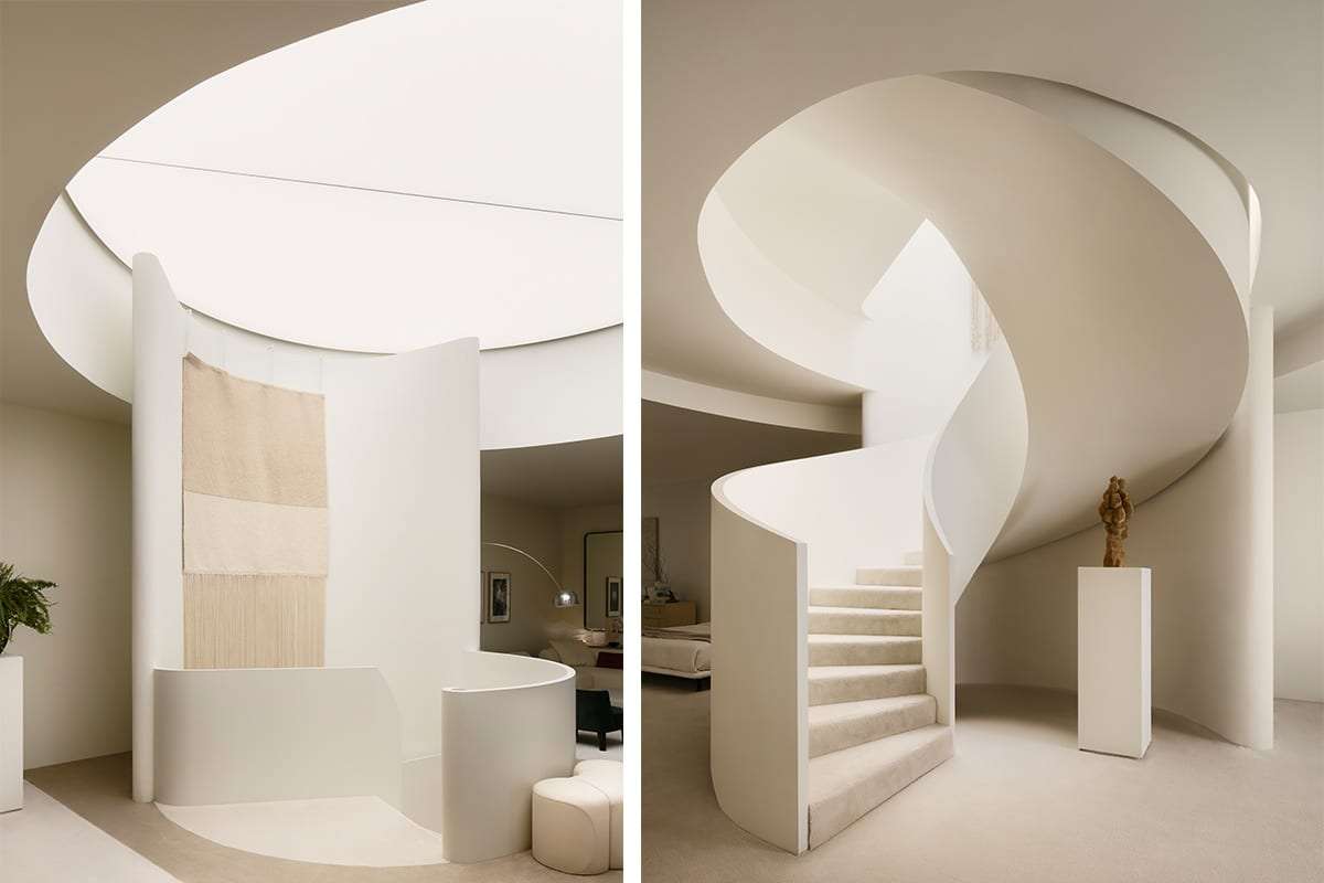 The curved interiors, from the sleek spiral staircase to the meandering walkways and intimate private nooks formed by the walls, are echoed in Meridiani’s opulent, modern furniture items.