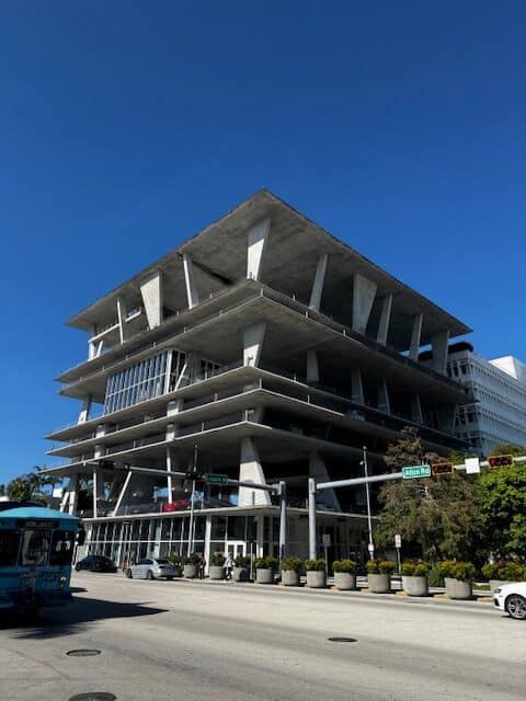 Amid this consumer boulevard lies one of Herzog & de Meuron’s most discussed Miami interventions: a parking garage turned architectural landmark. Exposed concrete, angled columns, and open slabs transform a utilitarian structure into a conversation with the city’s skyline. It challenges the decorative logic of surrounding Art Deco buildings by stating that minimalism, too, has presence.