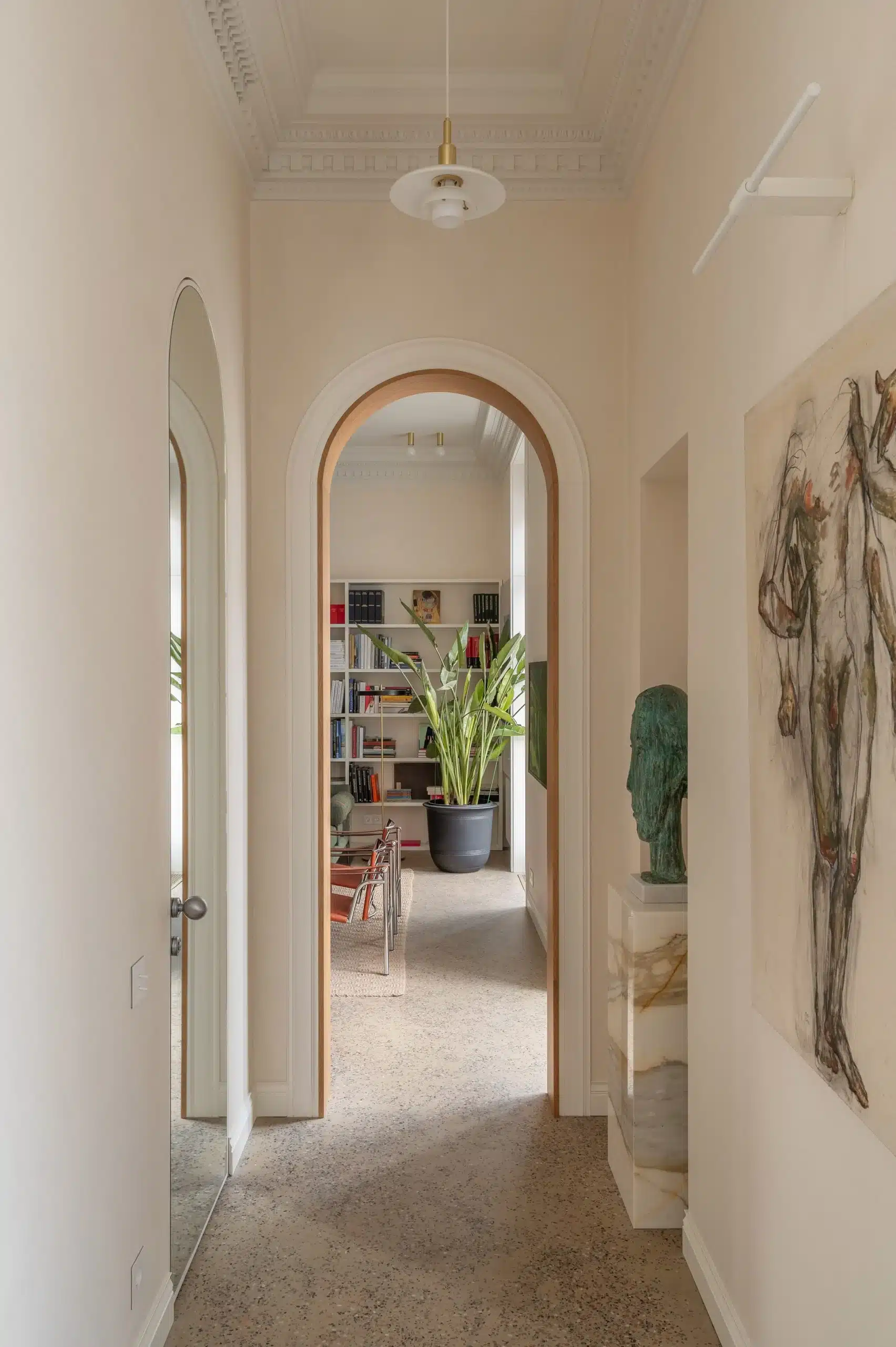 The traditional doors were replaced with open archways, featuring decorative moulding and inner wooden frames. These arches not only enhance the flow of space but also serve as a nod to the apartment’s historical roots, blending seamlessly with the modern updates.