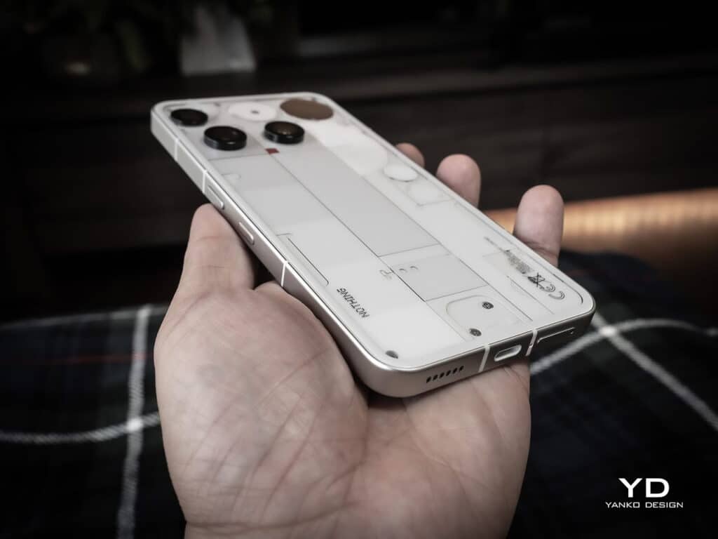 The Phone (3)’s design is its most divisive and compelling feature. Unlike the uniform camera islands of rivals, it adopts a deliberately scattered layout: two lenses housed in square modules, while a third sits in a diagonal oval cutout. This abstract arrangement evokes modernist art, challenging conventional aesthetics.