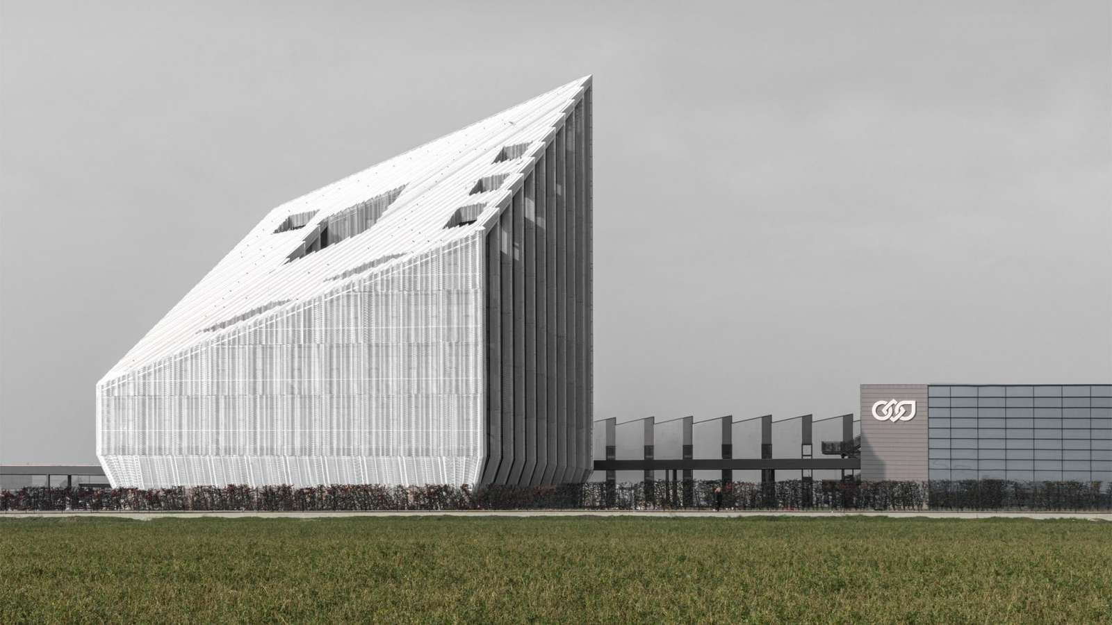 Peter Pichler Architecture, an Italian design studio, has created a distinctive headquarters for Bonfiglioli, a manufacturing company based in Bologna. This innovative structure features angular geometry and a slanted roof adorned with pleated mesh. Situated within Bonfiglioli’s industrial site in Calderara di Reno, the building stands out with its unique form and functional design elements.