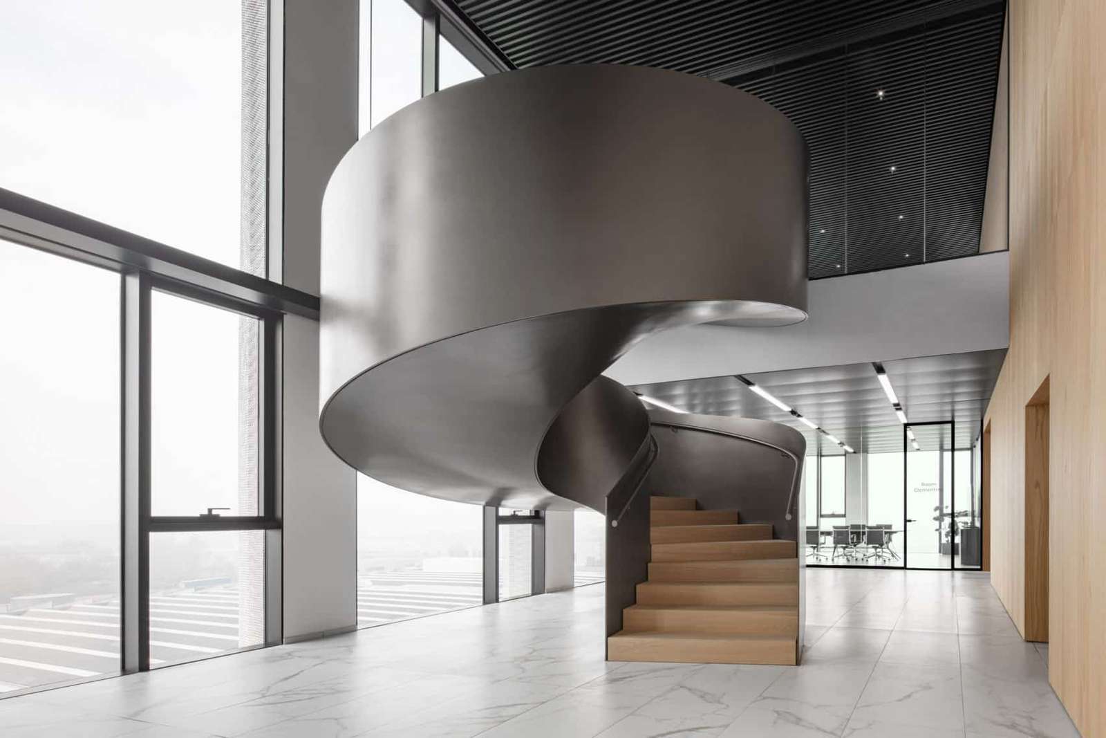 The interior spaces are animated by steel spiral staircases, strategically positioned on the ground and sixth floors. Beyond serving as physical connectors between floors, these staircases symbolize a vortex of creativity exchange, fostering a continuous flow of ideas within the workplace environment.