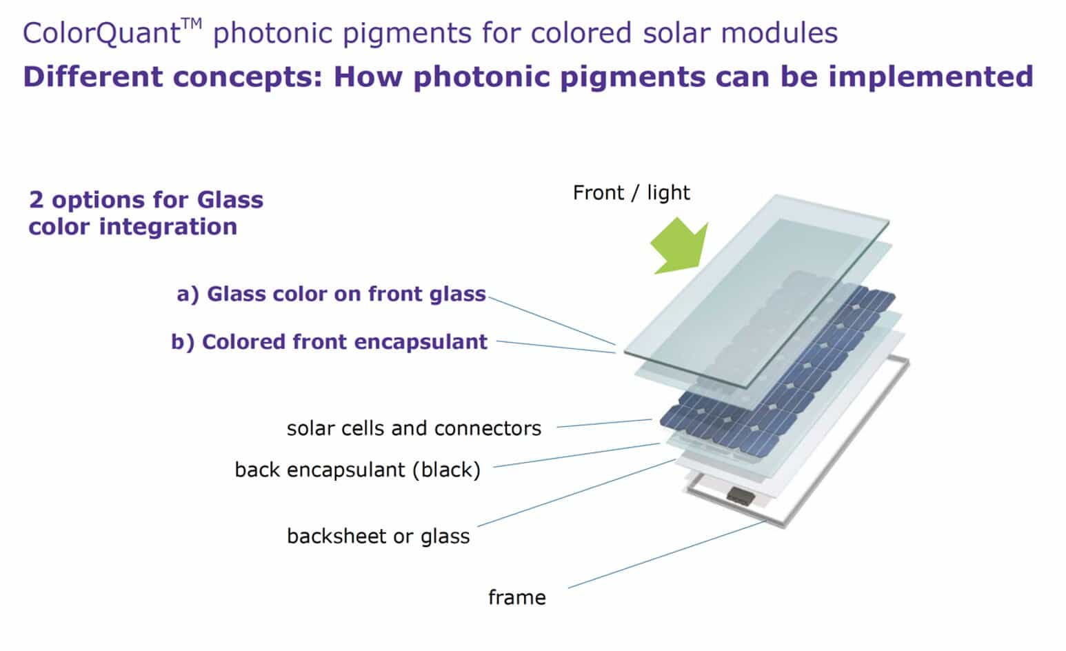 When it comes to incorporating photonic pigments into PV modules, there are various methods of doing so. For example, one can screen print, roller coat, or spray the color onto the front glass of the panel, or place the color into the encapsulant film immediately after the glass. The ColorQuant™ technology used for coloring of solar modules utilizes water-soluble ceramic pastes as pigments, and the color is created through interference of incident sunlight on the inorganic, eco-friendly pigments. This method allows the entirety of the light needed for the solar cell to generate energy to pass through, thus resulting in only a small decrease (ca. 10%) in the module’s power output, while still providing a rich, yet translucent hue. The diagram below shows the structure of a solar panel and how ColorQuant™ fits into the design.