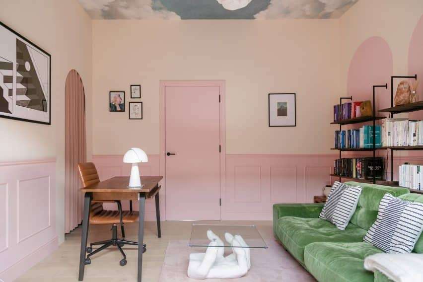 On the same level is a spare bedroom that can also be used as a changing area. Adorning the ceiling is a striped pattern that resembles the covering of a marketplace stall and the lavatory area is edged with black linear accents and painted pink.
