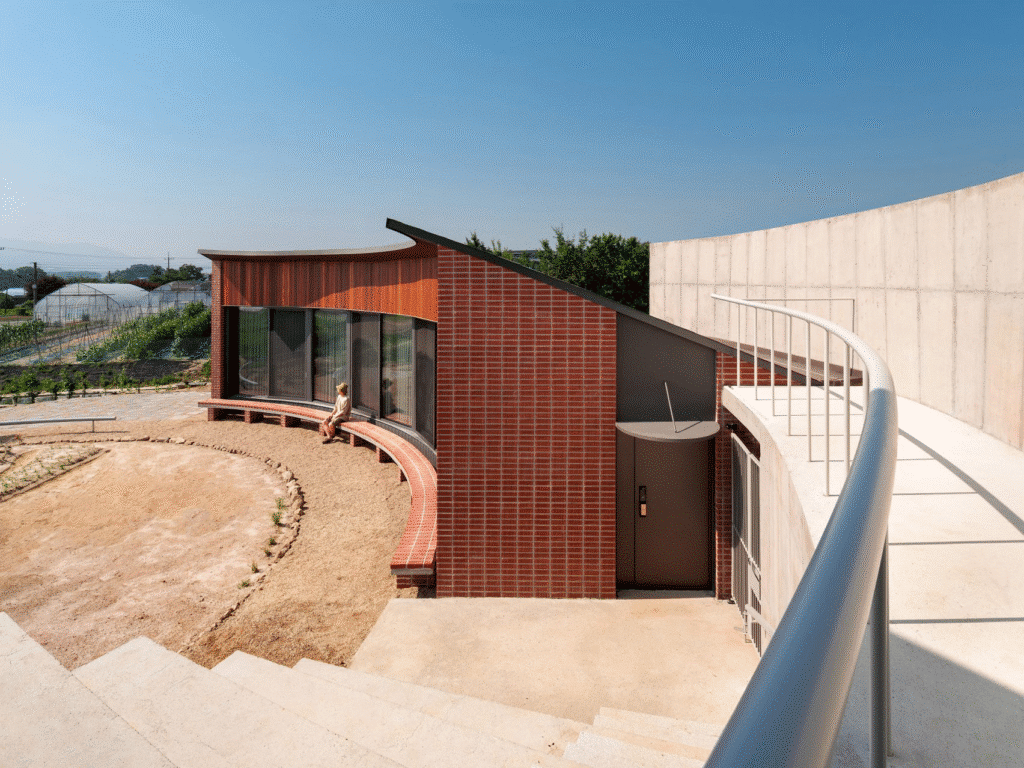 Pojeon House is a compact, carefully composed residence near Seoul that frames and protects a long-established vegetable garden while offering privacy and daylight to its occupants. The project places two interlocking volumes in dialogue with one another and with the plot’s existing green heart. One volume, wrapped in red brick, hosts the main living areas and opens generously to the garden. The other, finished in exposed concrete and polycarbonate, contains visitor accommodation and rises slightly to form a lantern at night. Together they form a single, embracing gesture whose primary spatial result is the protected courtyard garden.