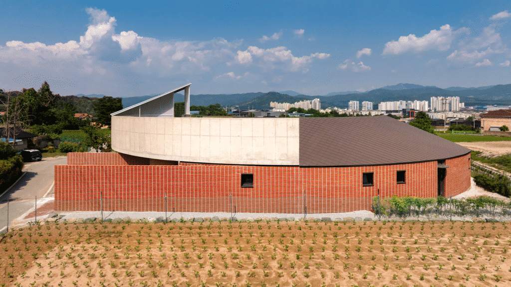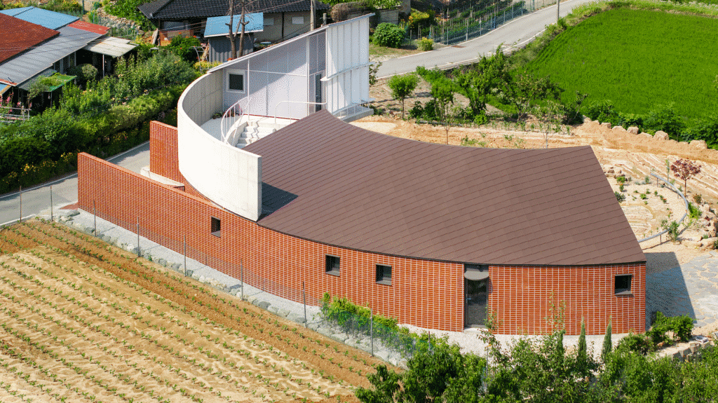The architecture is resolutely material and tectonic. Brick and concrete are used not as finishes but as defining structural and spatial elements. Timber and green tiles provide warmth and tactility inside. The project foregrounds how modest contemporary houses can rely on simple geometries and robust materials to produce layered spatial experiences that are rooted in habit, climate, and landscape rather than stylistic effect. This introduction outlines the core idea: Pojeon House is a small home that embraces the field and rethinks privacy as a findable condition rather than an impenetrable one.