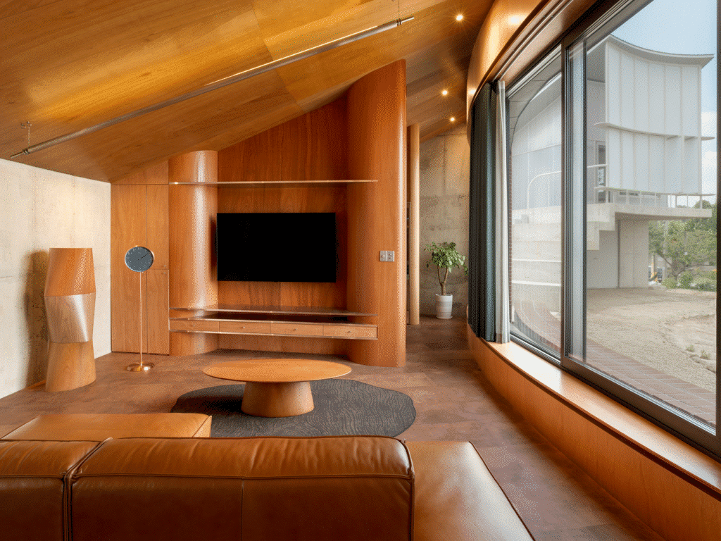 Material use is disciplined and honest. The visible tectonics—mortar joints, board-formed concrete textures, and timber grain—make the building legible. Spatially, the house privileges lateral movement and visual continuity over vertical complexity. The curved plan organises activities along the garden and slows movement, encouraging lingering and observation. This promotes a domestic rhythm that is intimate and observant rather than performative.