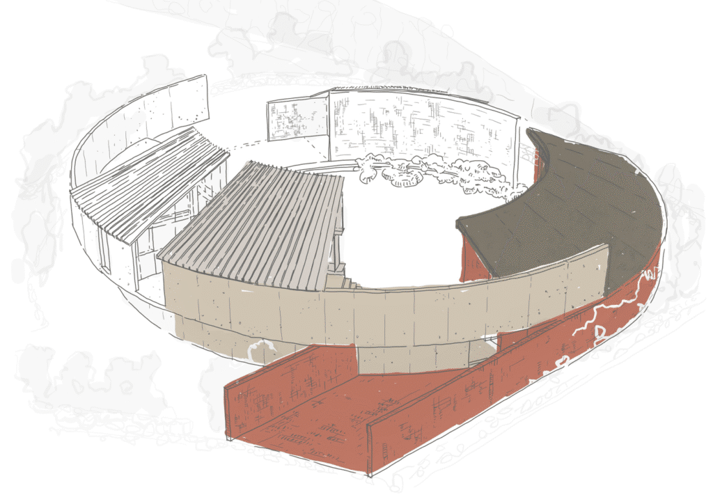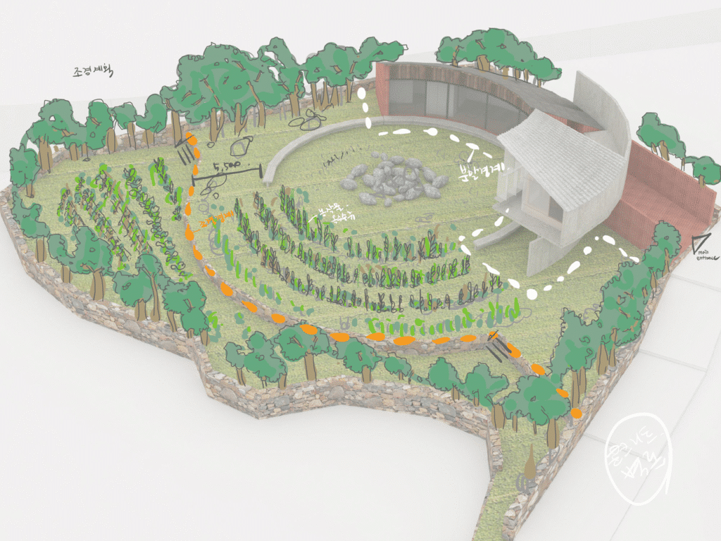 Pojeon House takes its name from the Korean word meaning a house that embraces the field. The fundamental design move is simple: two curved volumes merge around an existing, long-standing vegetable garden. This configuration preserves the cultivated plot while creating a sequence of sheltered outdoor rooms. The curved plan reads as a protective embrace when viewed from above and as a series of articulated façades at ground level.