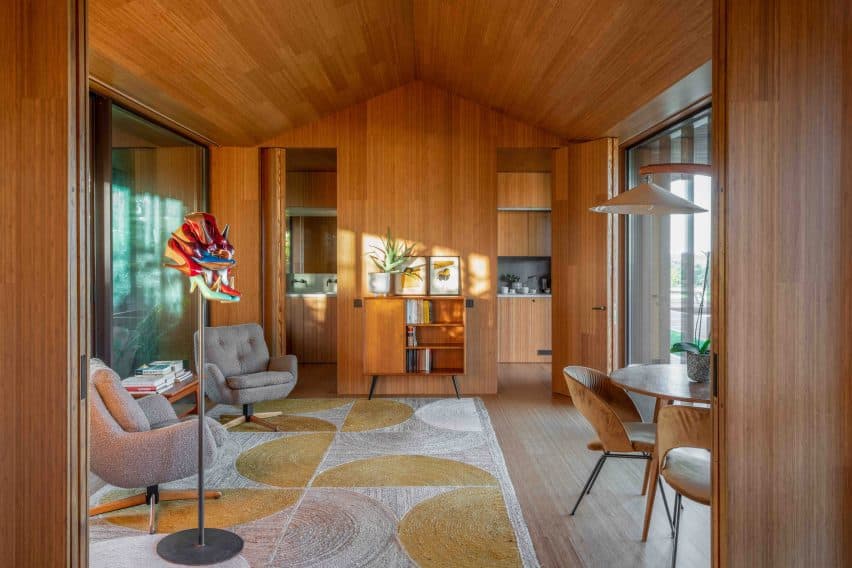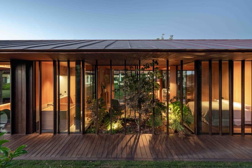 “The pavilion [creates] a dialogue between different architectures, with the pool as a central element and a link between the existing home and the new pavilion,” the firm told Dezeen.