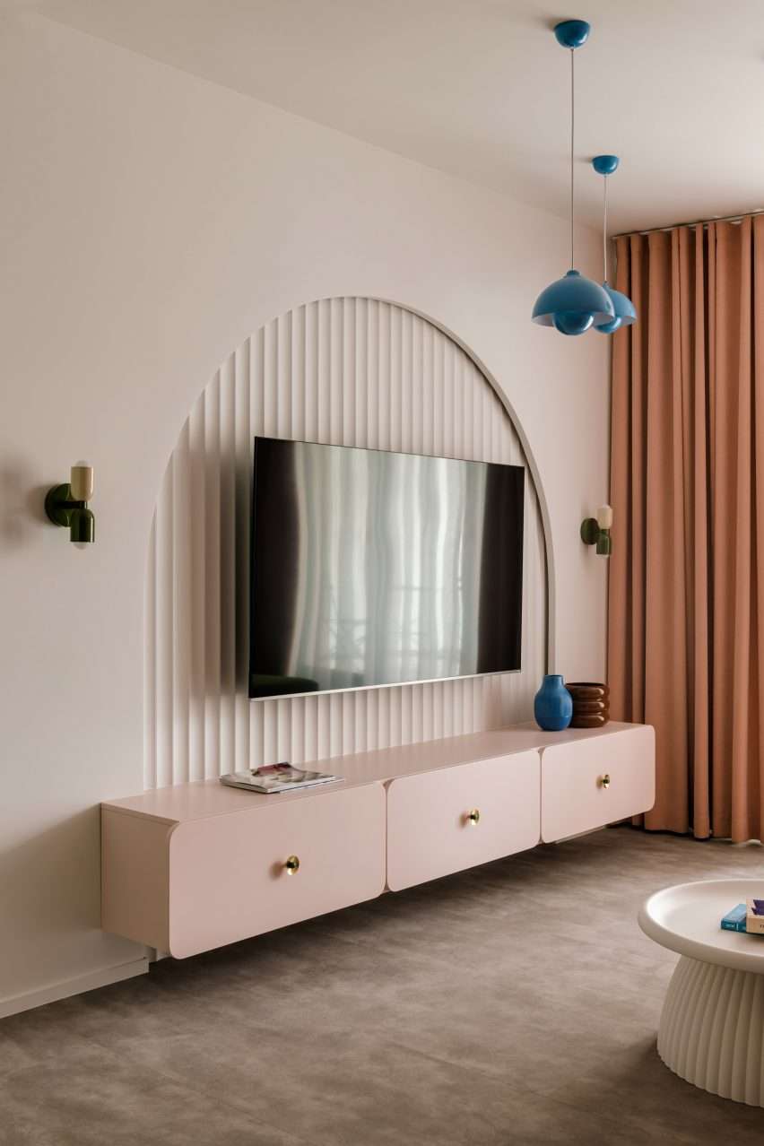 For instance, a circular dining table had a white and turquoise pendant light with scalloped edges hanging over it, and the wall-mounted television was set against a ribbed half-moon alcove.