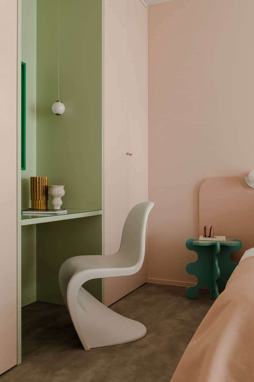 A sculptured Verner Panton chair stood in front of a light green built-in desk in one corner.