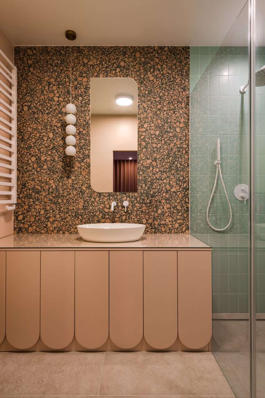 The bathroom is likewise filled with pattern, with pink and brown terrazzo tiles and a large cabinet with a scalloped edge.
