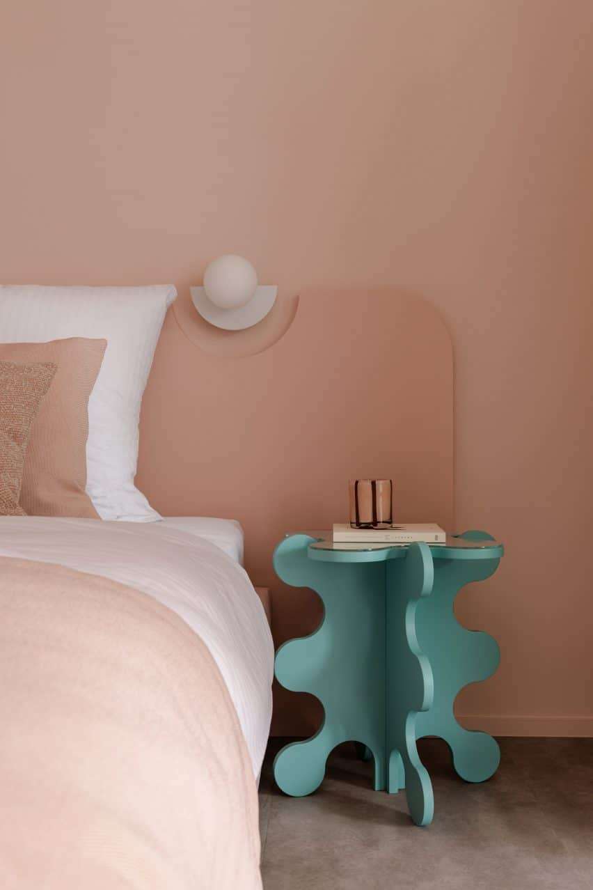 “A pink box with a whimsical headboard and an abundance of pillows” was how Łurek characterized the apartment’s double bedroom.