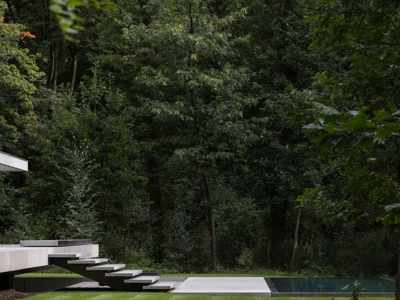 This house offers an experience of living in harmony with the rhythms of nature. In winter, the concrete acts as a thermal reservoir, retaining warmth while the surrounding forest transforms into a calm canvas of bare branches. As summer approaches, the green canopy fills out again. It creates dappled patterns of light on the floors and dissolves the glass walls as a barrier between inside and out.