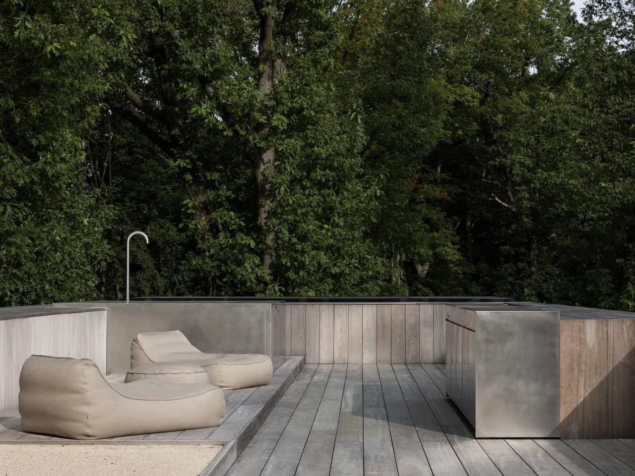 On another note, concrete is often perceived as a cold material. Yet here it transforms into an element that retains warmth. This is thanks to filtered sunlight and the surrounding greenery. The designers have maintained a limited color palette, allowing fabrics and natural textures to speak for themselves without visual clutter.