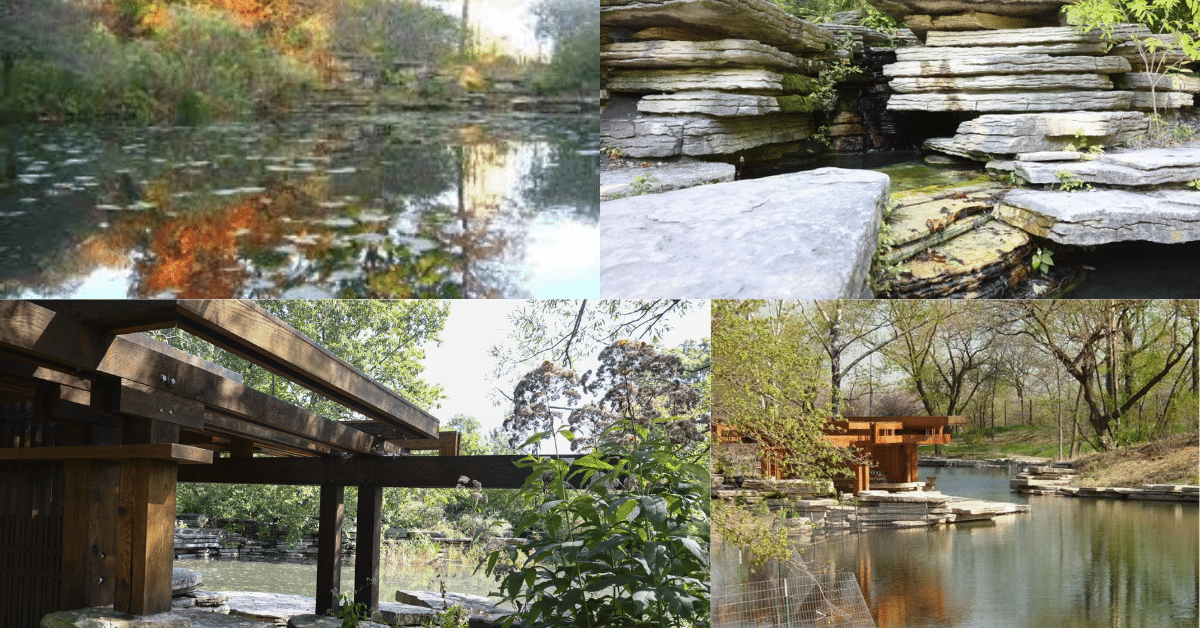 The garden’s design reflects the vision of architect Alfred Caldwell, who saw every stone, tree, and stream as parts of a single living composition inseparable from the land itself. The stone paths curve gently like the wind through the prairie grass, while low natural stone walls blend seamlessly with the terrain, preserving the visual flow of the landscape. At the center, the main pool wraps around a dense green area that mirrors the sky and shifting light, creating a scene that changes with every passing hour.