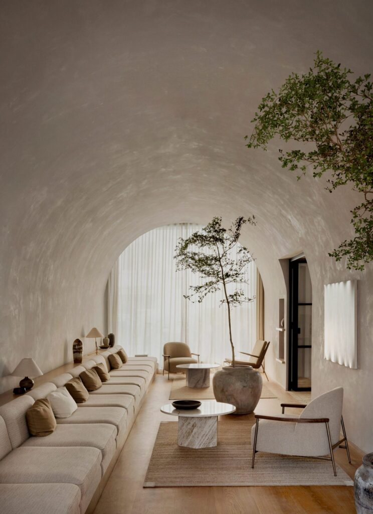 One standout area is the tunnel-like lounge with a curved ceiling, facing an internal courtyard garden. The ceiling’s gentle arc, paired with greenery and soft lighting, reinforces a sense of enclosure and transition. Along one side, a continuous custom sofa offers an inviting place to dwell — more akin to a living room than a lobby.