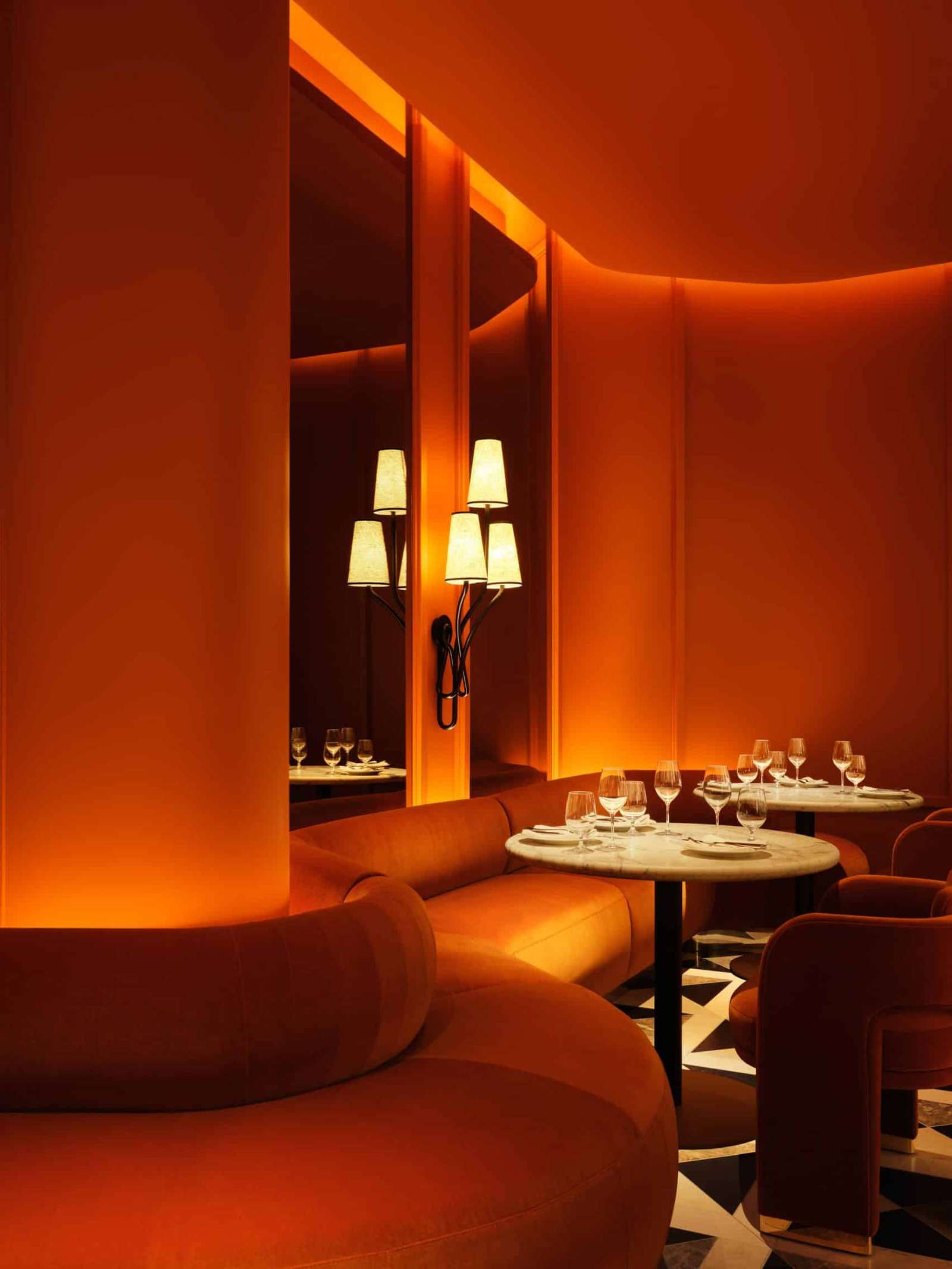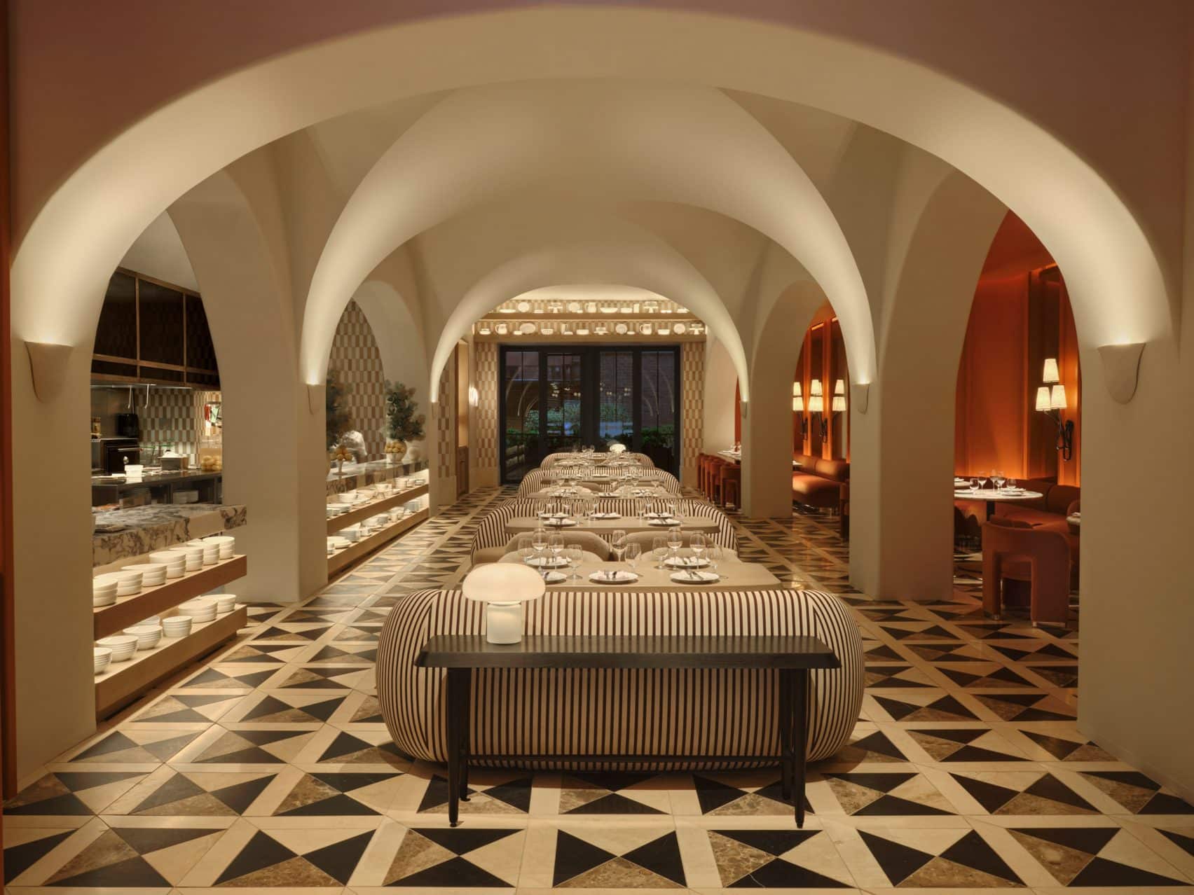 The dining area features a line of tables paired with rounded striped sofas and boucle-covered chairs, while a burnt orange-colored space adds a cozy and intimate atmosphere.