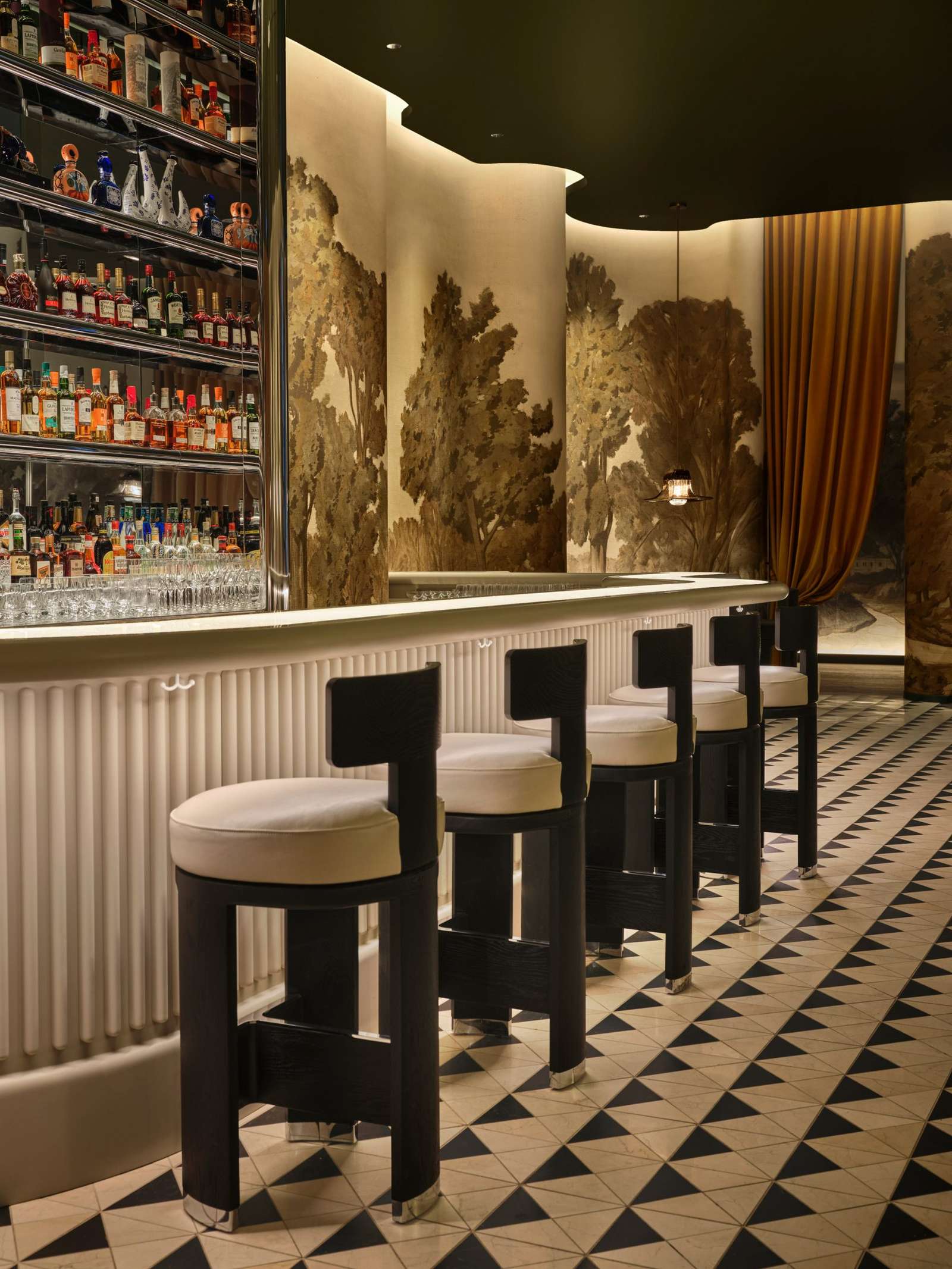 The bar area features wavy walls, green banquettes, and a hand-painted landscape mural, offering a verdant and visually stimulating environment.