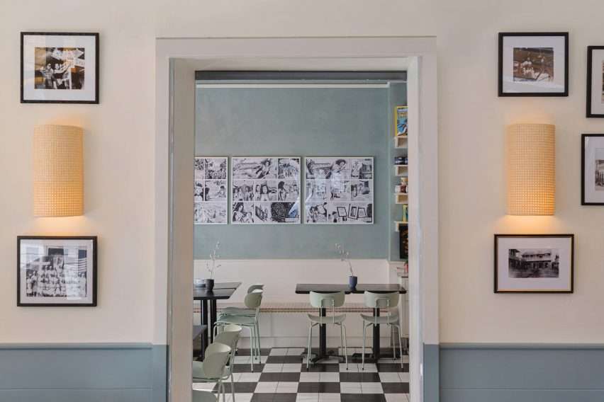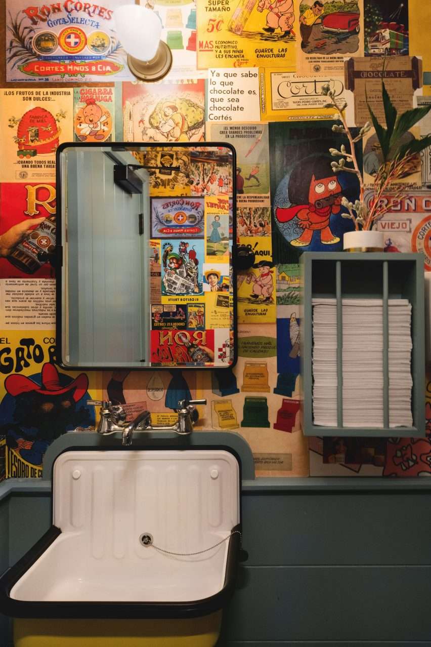 Pale green-grey plaster was applied above wood wainscoting on the cafe walls. Therefore, displaying a mix of historic photos and artwork by local and Caribbean artists. The bathrooms within the cafe are decorated with a collage of vibrant cartoons and vintage advertisements, while cheerful jingles streamed from the speakers.