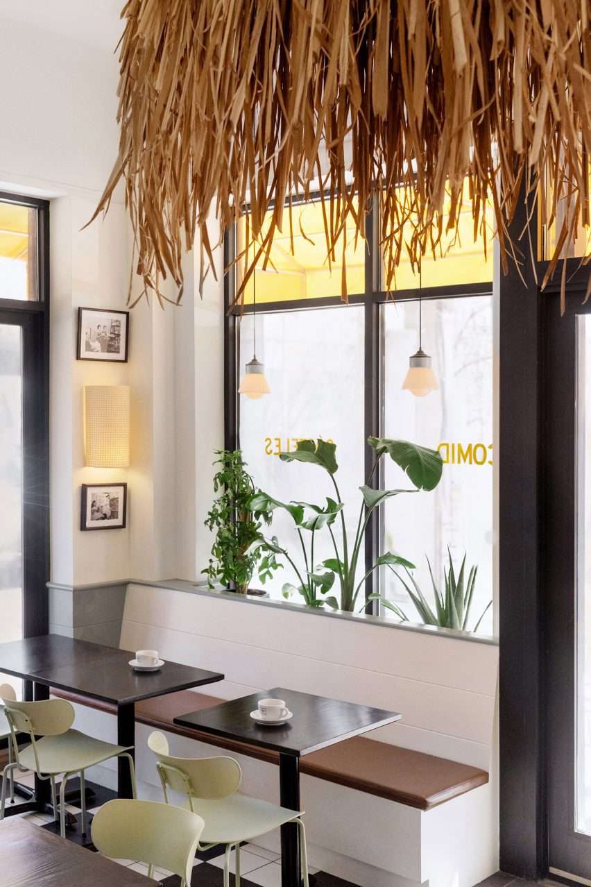 The back bar and bathroom entrances feature three breathtaking Spanish colonial-style arches that encase niches. Wearing the cafe’s signature bright yellow hue, the arches flawlessly match the cafe counter. And bring a vibrant and welcoming atmosphere to the area.