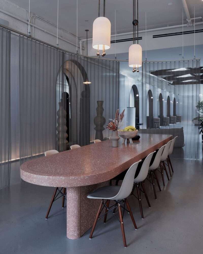 Except for a central planter made of pink concrete that complements the consultation table and the counter. The open area, which also serves as a venue for creative gatherings and events, is sparsely inhabited.