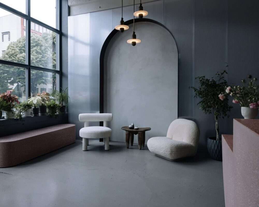 One arch serves as a backdrop for a lounging area with boucle-covered chairs and pendant lighting by Apparatus above in the front of the studio, next to the wall of glass.