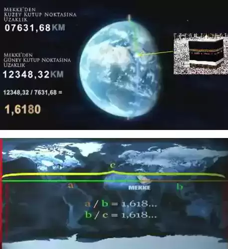 It is interesting to note that the Golden Ratio Point of the World is located in the city of Mecca. According to the map of latitude and longitude commonly used for locating a certain place. This can be measured by determining the proportion of the distance between Mecca and the North Pole to the distance between Mecca and the South Pole which in this case is 1.618, the golden mean. Additionally, the same ratio is observed when calculating the distance from the South Pole to Mecca and the distance between the two poles combined.