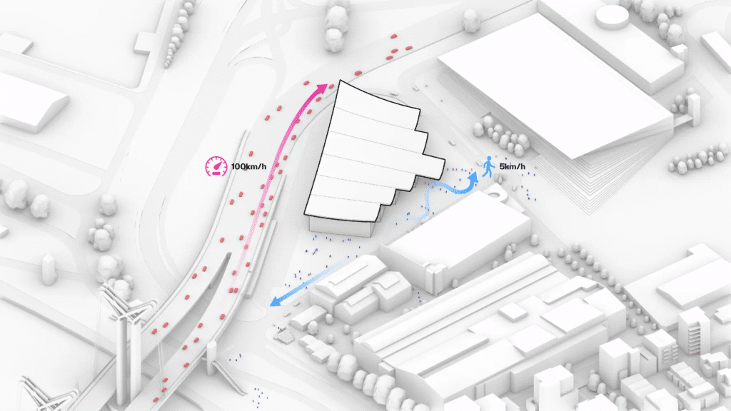 The concept behind the design is namely movement, transparency, and the fluid coalescence of the building with the environment. The upward movement of the form is indicative of the wind’s direction and the waves’ rhythm; hence, it is considered an architectural representation of movement that is stopped in time. The vision of BIG swaps the traditional congress type with a civic promenade leading from the waterside through the plaza and connecting with the adjacent roads. The reasoning is in the idea of continuity: the building is a pathway, the roof is the sky, and the structure is the public ground, an idea that has its traces in modern architectural research.