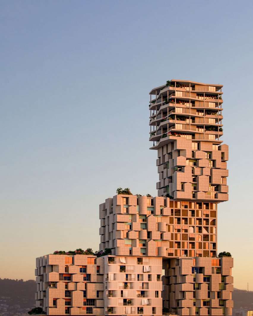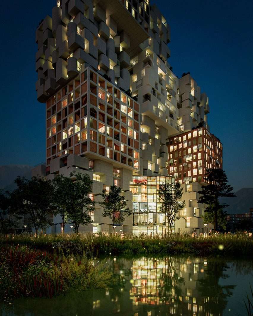 According to the studio, the typical height of buildings in Tirana is seven stories, and the building they designed consists of 13 cubes in seven variations, each with dimensions of 22.5 metres by 22.5 metres.