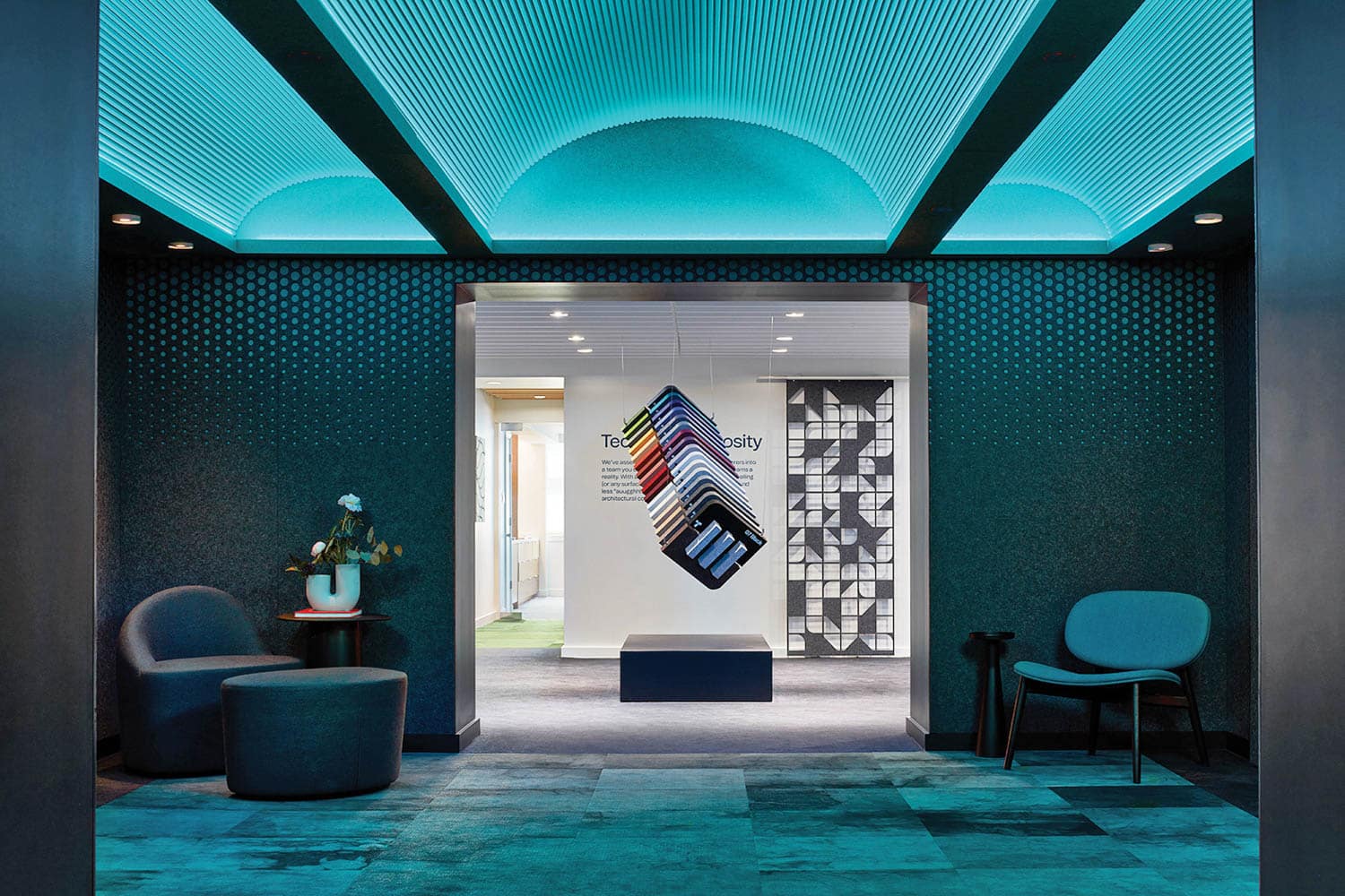The heart of Turf’s showroom lies in its vibrant themed spaces, each designed to demonstrate the prowess of the brand’s acoustic solutions. The Cyan Extremes room, drenched in a mesmerizing blue hue, features dramatically swooping ceiling shapes that not only captivate the eye but also showcase the full dimensionality of Turf’s product offerings. These spaces are more than displays; they are immersive environments, inviting visitors to experience the transformative power of acoustic design.