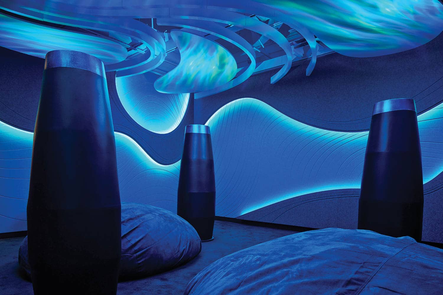 Amidst the lively showcases, Turf has carved out a meditation room – an oasis of calm and quiet relaxation. Inspired by the ethereal beauty of the Northern Lights, this space offers a stark contrast to the energetic vibrancy elsewhere in the showroom. It stands as a testament to Turf’s versatility in creating environments tailored to diverse needs.