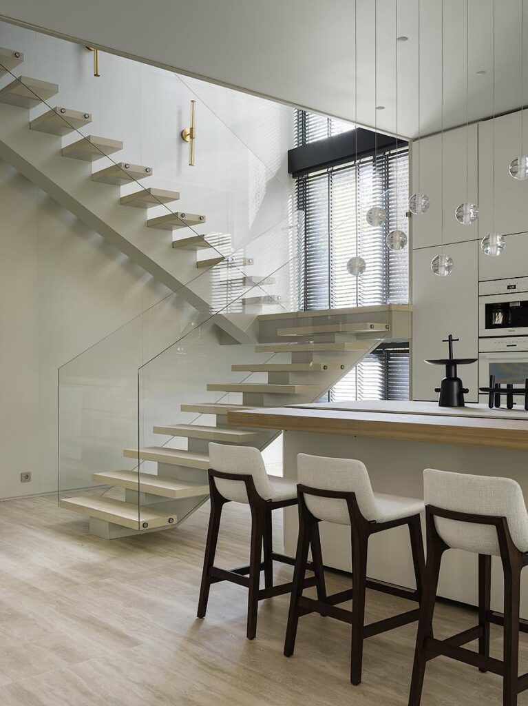 “The effect of mutual integration with the surrounding landscape is reinforced by the geometry of the ground floor: here, a glazed terrace and panoramic windows coexist with an open-plan layout, rounded wall contours, a demure colour palette and natural materials. The same principle governs the second-floor spaces — light beige and olive tones are combined with the texture of wooden panelling and textured marble. Subtle, precisely calibrated accents and decorative elements emphasise the balance between geometry and textures.