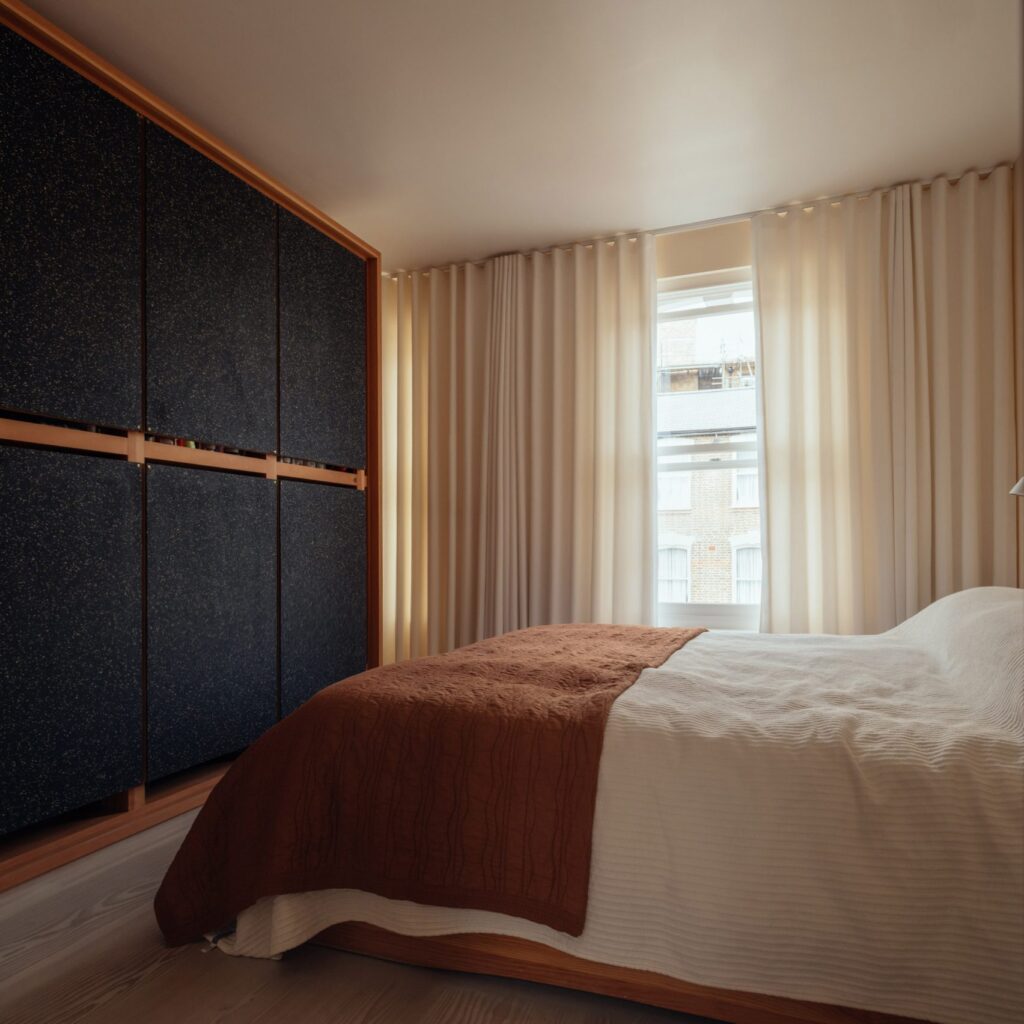 This wood also forms the backbone of the home’s bespoke interior detailing: door frames, windowsills, wardrobes, and even a custom-built bed frame. This consistency of material provides visual calm and a sense of cohesion, making the home feel considered, curated, and intimate.
