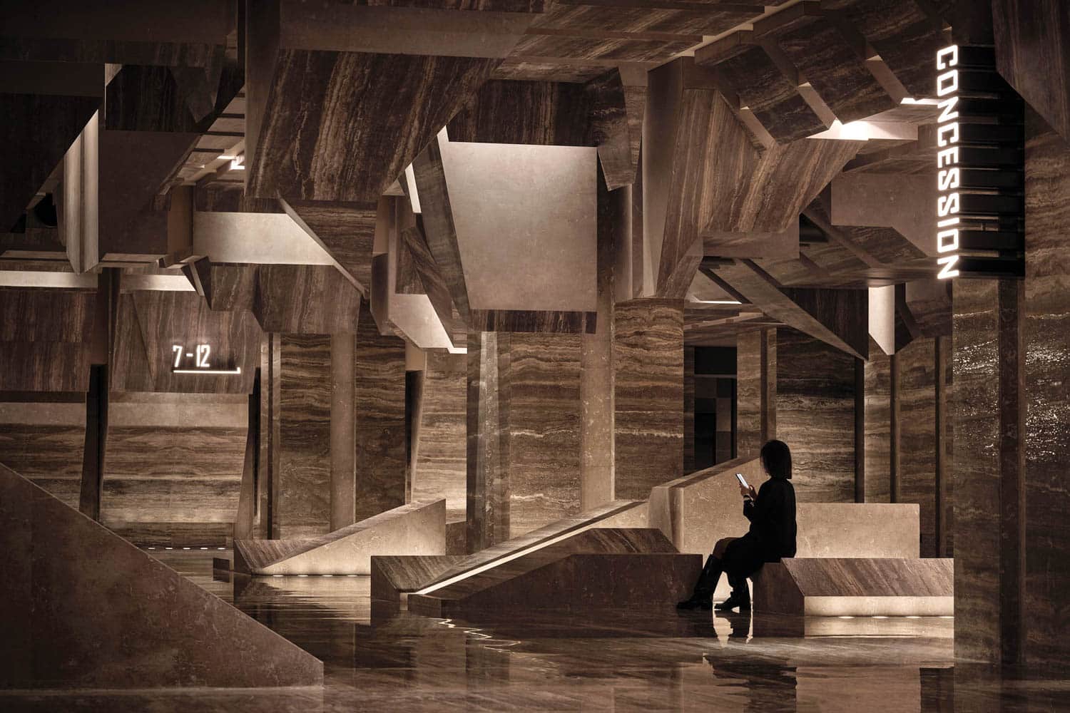 The commitment to design excellence extends to the auditorium seating, where the same technique is applied. Upholstered in patterns mirroring the natural stone, the seating offers not just comfort. But a seamless continuation of the design narrative. Each seat becomes a part of the overall visual experience. Therefore, ensuring that every aspect of the cinema contributes to its unique atmosphere.