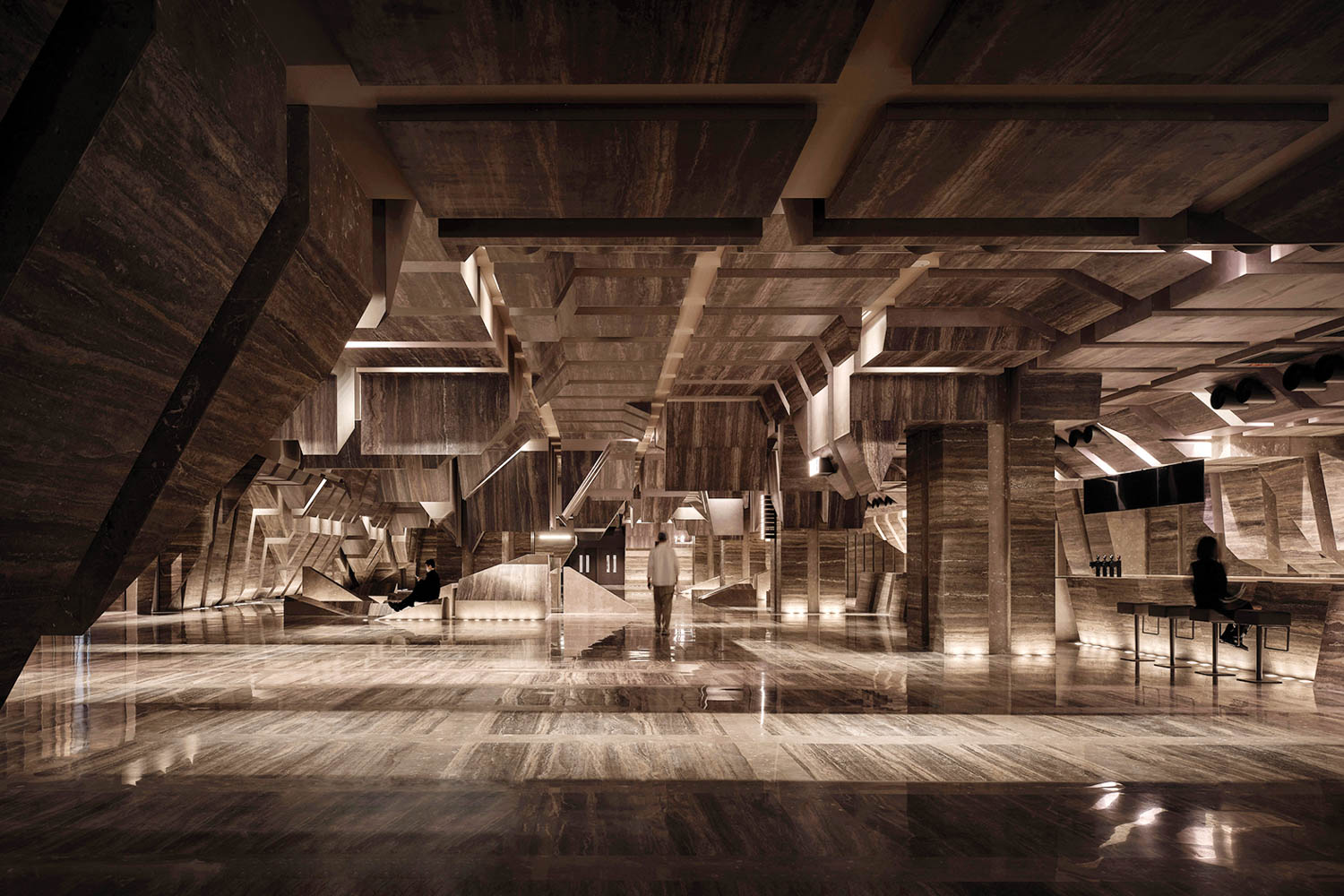 In the vibrant city of Wuhan, China, One Plus Partnership has drawn inspiration from the captivating aerial view of a cityscape to create a cinematic masterpiece. This 90,000-square-foot cinema, nestled within the Wushang Dream Mall, is a dark and sophisticated marvel clad in marble. Let’s delve into the intricacies of this architectural gem that transforms cinema-going into a noir-meets-brutalist experience.