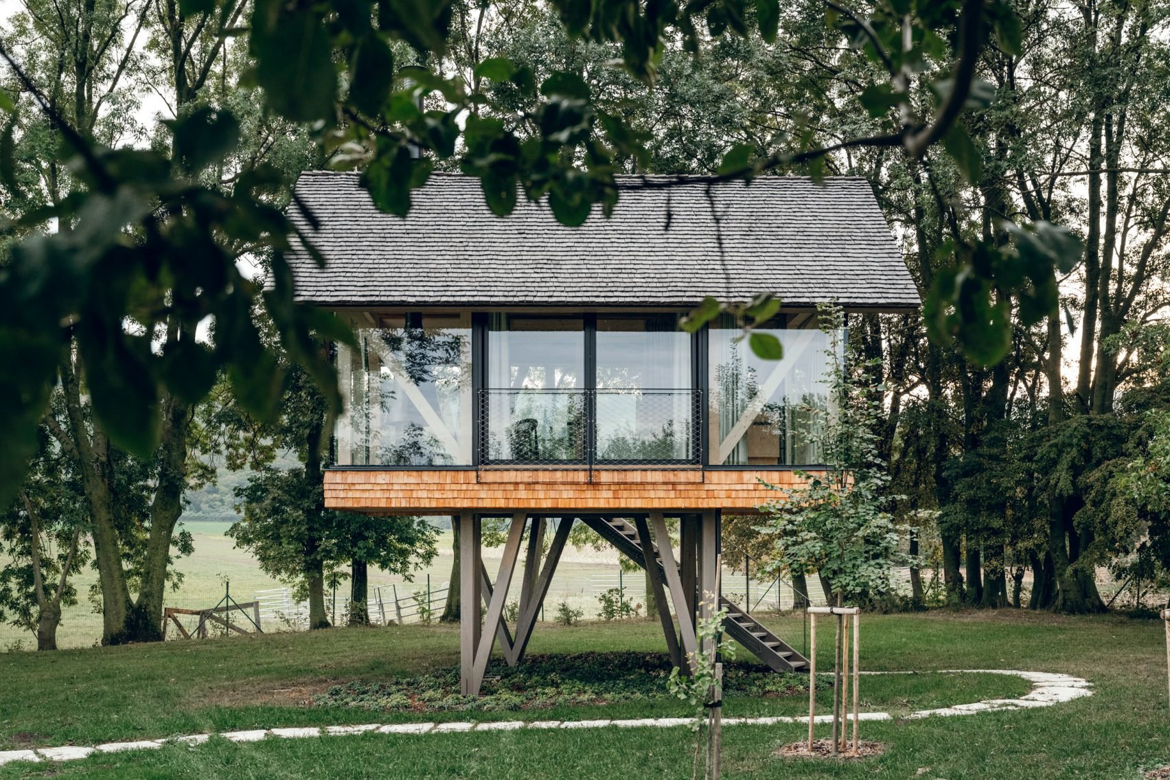 Nestled on a remote farm in Hainburg an der Donau, Zen House was conceived for clients seeking a compact yet immersive living experience. Elevated four metres above the ground on concrete columns, the home boasts an archetypal house shape enveloped in glass, allowing uninterrupted views of the grove of mature trees and the newly planted orchard that surrounds it.